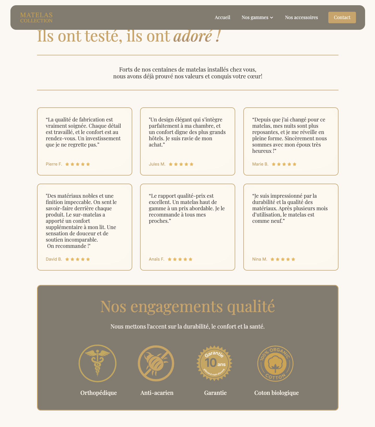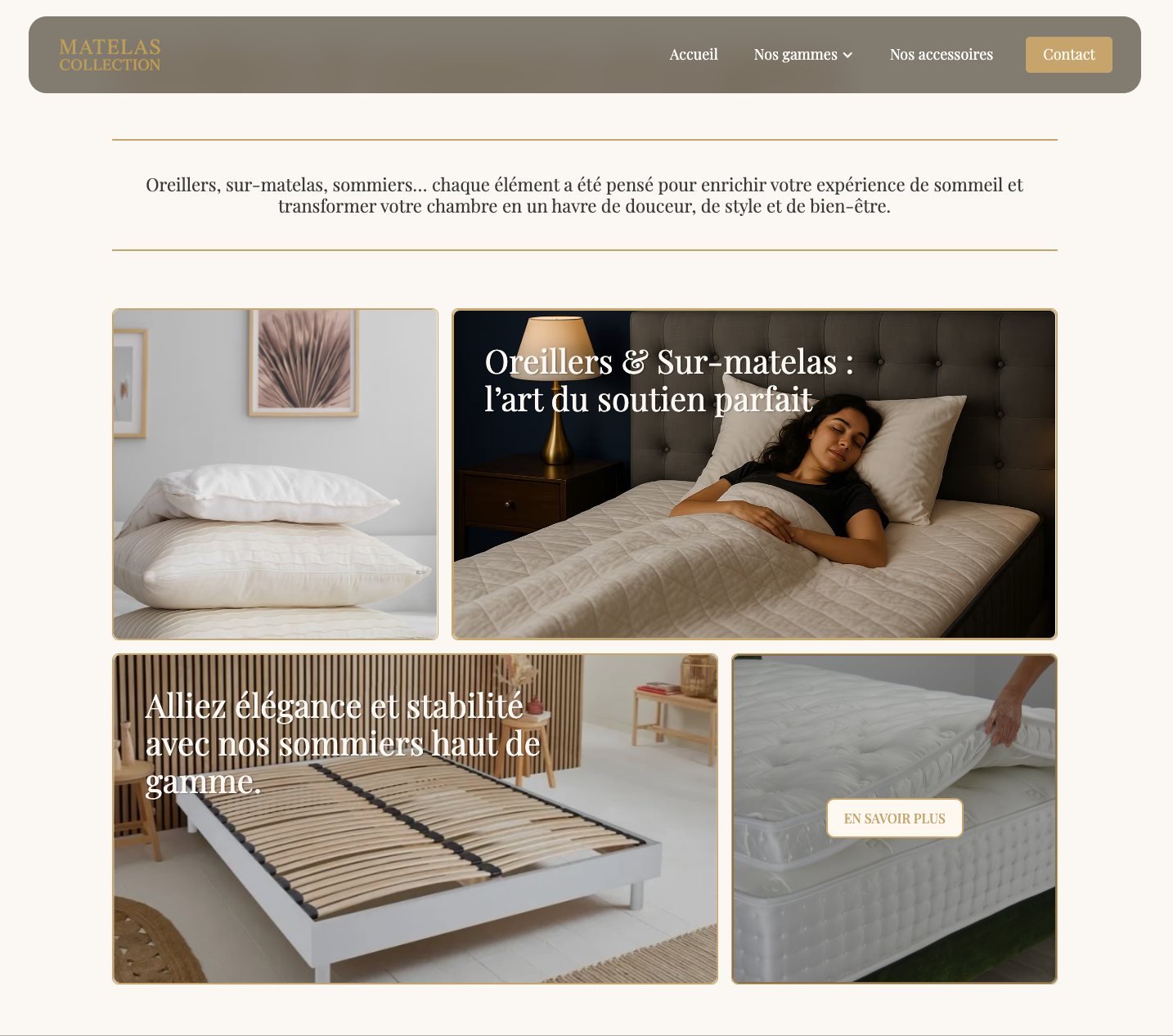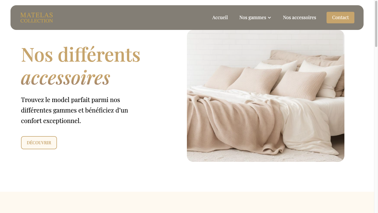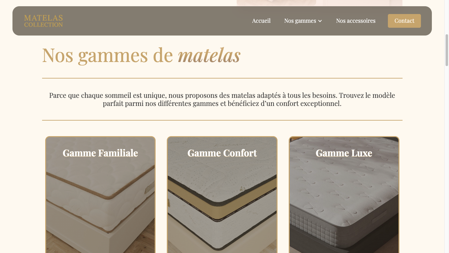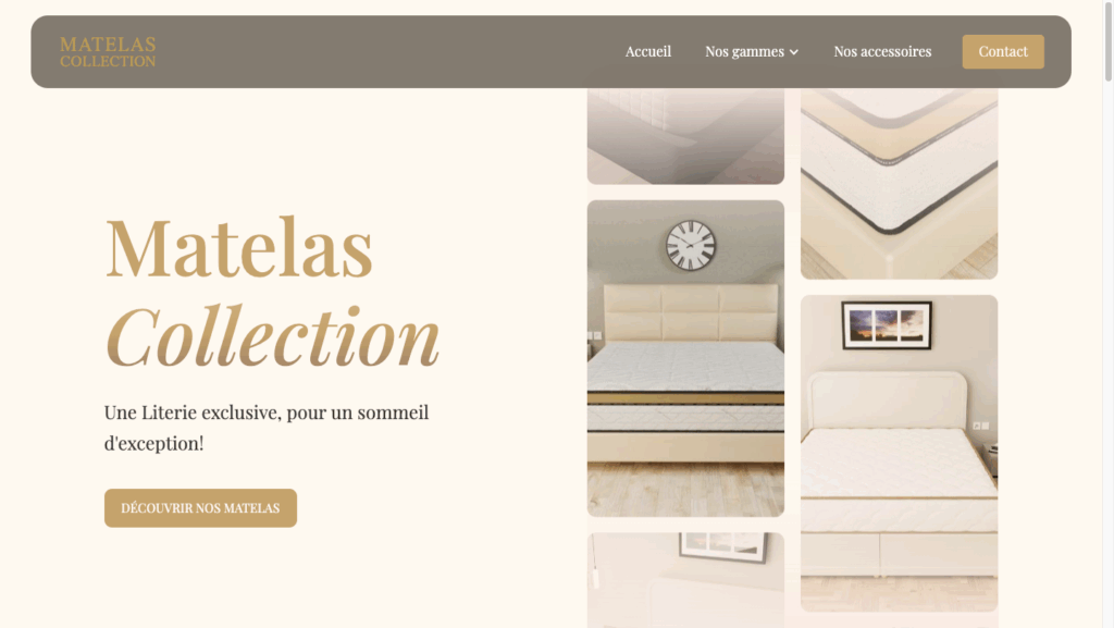 Matelas Collection est un site vitrine que j’ai entièrement désigné sur Webflow, mettant en avant l’élégance et la simplicité d’une expérience utilisateur moderne. Le site présente trois catégories de matelas, ainsi qu’une sélection d’accessoires complémentaires.